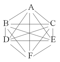 下の図のように、A~Fの6つのアルファベットが、それぞれ線で結ばれています。
