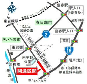 今回開通した区間は、国道16号の春日部市増戸(アルファオート前の信号)から岩槻区南平野のさいたま市境までの延長約430mです。