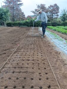 これまでは、季節の野菜の種を蒔く時には等間隔に測って棒先で穴を開けて種を蒔いていたのですが、何とか良い方法がないものかと思案したところ、種を蒔く幅に合わせてグラウンドなど広い場所を平らにする「トンボ」や「レーキ」のようなものを作ってみた。